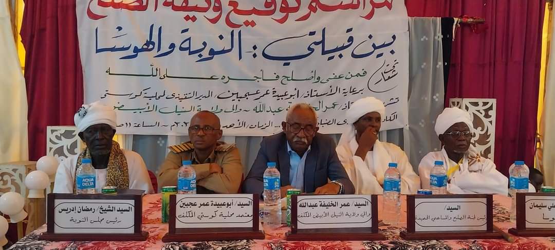 شهد الأستاذ عمر الخليفة عبد الله والي ولاية النيل الابيض رئيس لجنة الأمن بالولاية وقيادات الأجهزة العسكرية والشرطية والأمنية والعدلية وأعضاء حكومة ولاية النيل الابيض وقيادات الإدارة الأهلية ولجنة المساعي الحميدة ولجنة الصلح بين القبيلتين والطرق الصوفية وأعيان مدينة كوستي ، شهدوا اليوم بقاعة نادي الضباط بكوستي مراسم توقيع وثيقة الصلح بين قبيلتي النوبة والهوسا