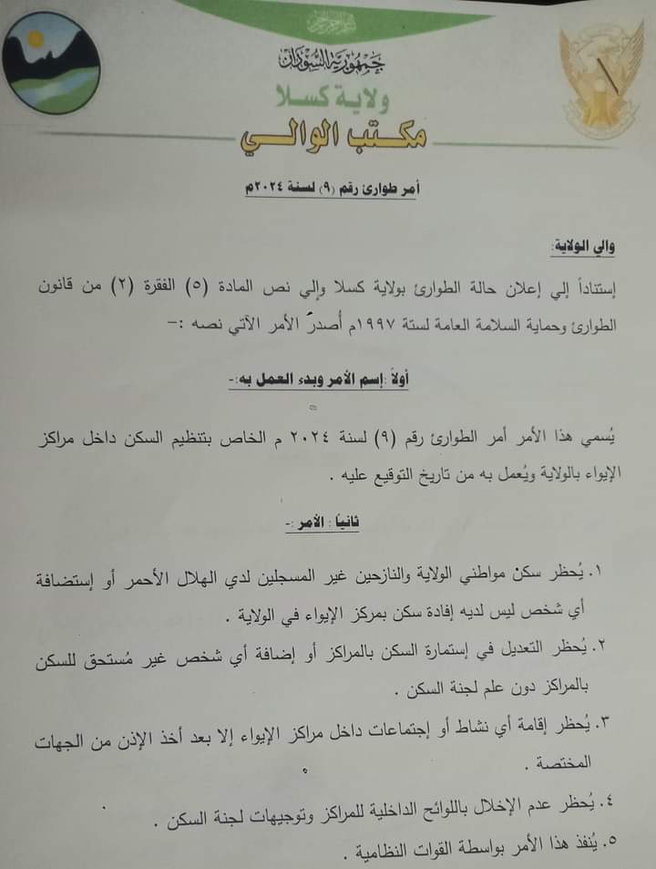 اصدر محمد الصادق الازرق والي كسلا المكلف امر طوارئ حظر بموجبه سكن مواطني الولاية والنازحين غير المسجلين لدي الهلال الأحمر والاشخاص الذين لايملكون إفادة بمراكز الايواء بالولاية،كما حظر امر الطوارئ التعديل في إستمارة السكن بالمراكز أو إضافة أي شخص غير مستحق للسكن بالمراكز دون علم لجنة السكن.