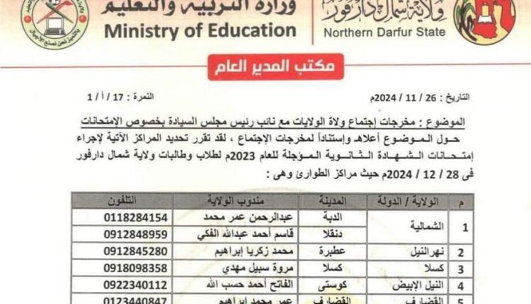 حددت وزارة التربية بشمال دارفور مراكز امتحان الشهادة السودانية المؤجلة للعام ٢٠٢٣م ومناديب الولاية واخر موعد للتسجيل ، حيث تشمل المراكز الولاية الشمالية تحت اشراف المندوب عبدالرحمن محمد عمر و نهر النيل محمد زكريا ابراهيم و كسلا مروة سبيل مهدي و النيل الابيض الفاتح احمد حسب الله ، والقضارف عمر محمد ابراهيم ، وغرب كردفان محمد ابراهيم بشير