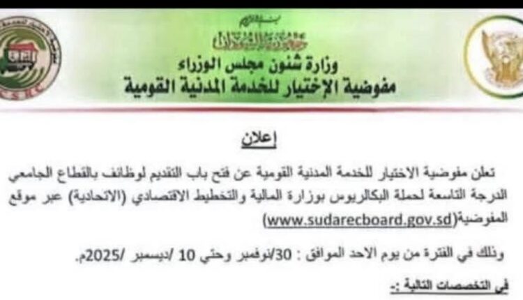 تعلن مفوضية الاختيار للخدمة المدنية القومية عن فتح باب التقديم لوظائف بالقطاع الجامعي الدرجة التاسعة لحملة البكالوريوس بوزارة المالية والتخطيط الاقتصادي (الاتحادية) وذلك في الفترة من يوم الأحد الموافق: 30 نوفمبر وحتى 10 ديسمبر 2025م.