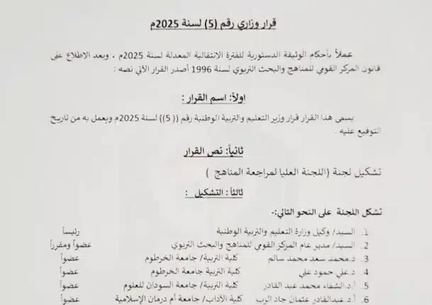 متابعة – الجمهورية نيوز- أصدر وزير التعليم والتربية الوطنية، تهامي الزين، اليوم الاثنين، القرار رقم (5) لسنة 2025م، القاضي بتشكيل لجنة عليا مختصة بمراجعة مناهج التعليم العام في البلاد، في خطوة تهدف إلى تطوير المحتوى التعليمي بما يتماشى مع متغيرات الواقع السوداني.